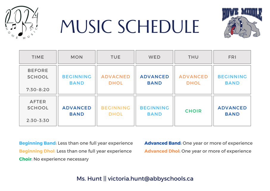 While music classes are fun, Howe Musicians are expected to work hard and be dedicated music students. Please be aware that you are expected to practice regularly, that concert participation is mandatory, and that you are expected to attend all rehearsals unless otherwise discussed with Ms. Hunt. If you have any questions or concerns, Ms. Hunt would love to hear from you at Victoria.Hunt@AbbySchools.ca.